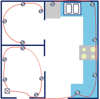 En la cocina pueden instalarse contactos sencillos para circuitos de 20 A (recuerda que la NOM solicita al menos 2 circuitos de 1800 VA para esta área). Sin embargo, debes tomar en cuenta que los contactos también deben proveer una protección contra falla a tierra. Algunos fabricantes ofrecen en sus líneas de productos los contactos con protección contra falla a tierra con la posibilidad de instalar otros contactos sencillos y de esta forma proteger todo un circuito completo, tal como se muestra en la Figura 1, donde se puede apreciar que cada uno de los tres circuitos llega a un contacto ICFT (Interruptor de Circuito por Falla a Tierra) o GFCI (Ground Fault Circuit Interrupter, por sus siglas en inglés).